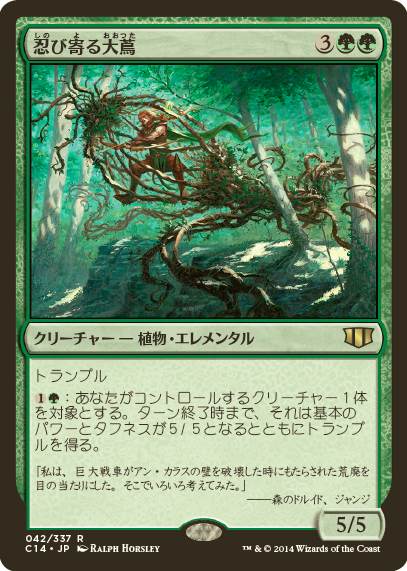 A quién no le gustan los 5/5 que arrollan? Pues aquí tenemos un 5/5 que arrolla que convertirá a tus bichos (no a los del contrario, ojo) en 5/5 que arrollan (o más concretamente, le ponen fuerza y resistencia base 5/5 y aparte le dan arrollar; el resto de las habilidades, como por ejemplo Infect, se quedan). Mola un pasote, y desde luego será muy, muy divertido en Commander, pero en Legacy ese coste cinco y esa falta de defensa dan muy mal rollo.