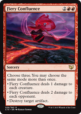 Bonito Command! Esta vez con tres opciones, y la opción de repetir (esto último es interesante). Se puede elegir 1 daño a todos los bichos (para hasta 3), 2 daños a todos los oponentes (para hasta 6 - Auch!), o cargarse un artefacto. Éste puede tener potencial para juego competitivo en Legacy, pero el coste de 4 no es demasiado manejable, y realmente para lo que querrás usarlo será para matar criaturas, siendo difícil que se juegue en lugar del Wrath of the Gods, el Firespout o cualquiera de los demás trucos por tres manás.