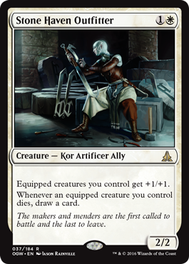Otro Lord de Equipos más para la colección! Éste ya es mejor que Maestro armero (eso de sólo dopar Kor sencillamente es patatero), pero está a años luz del siempre legendario Auriok Stellshaper (eso sí que era un Lord de Equipos!). Así y todo, malo no puede ser con una buena ferretería: darle +1/+1 a cada bicho con equipos encima puede hacer que finalmente sirvan para algo esos clásicos Equipos que sólo dan evasión, y eso de que como se te muera un bicho equipado, robas carta, redondea el conjunto. Este bicho para ser bueno necesita, obviamente, un buen chorro de Equipos buenos, y en Standard andamos bastante mal de eso (a menos que lo arreglen en esta colección; conque pongan uno o dos Equipos con calidad suficiente para Construido ya podemos hacer algo con esto), pero en Modern (donde también es legal el Auriok Stellshaper) hay mucho donde elegir, incluídas las siempre temidas Espadas. Sin duda, un bicho interesante.