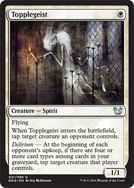 Como por ejemplo, este simpático fantasmita. Tal cuál entra, tapea un bicho - es flojo, pero por un maná blanco no vas a esperar un Chant of Orim criatura. Lo divertido viene cuando tienes el cementerio cargadito... Si tu Tarmogoyf pega de cuatro o más (sólo contando tu cementerio, claro), ahora tapeas una cosa por turno. Lo mejor? Tapeas una cosa por turno DE TU OPONENTE! Con el Delirio, esto es prácticamente una Ley marcial criatura, por un maná! Realmente no se me ocurriría cómo algo como esto no puede ver juego (podría incluso humillar a Ulamog - tener al Ulamog del oponente tapeado todos los turnos es tan delicioso como troll).