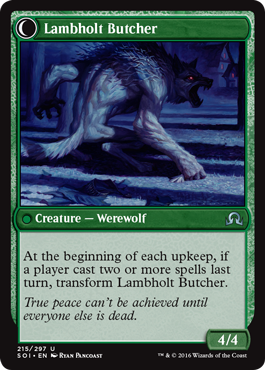 No mala idea, desde luego: como alguien intente jugar cosas fuera de turno, robas carta (dos si esto está en modo lobo). Aparte de ser un buen hate contra mazos controleros, eso obligará al oponente a hacer la doble jugada para apagar tus Werewolves en su propio turno, lo cuál puede fastidiar algunas estrategias.