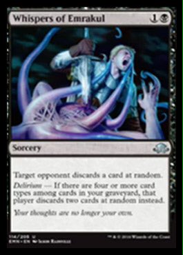 (Sorcery; Target opponent discards a card at random; Delirium - If there are four or more card types in your graveyard, that player discards to cards instead;)