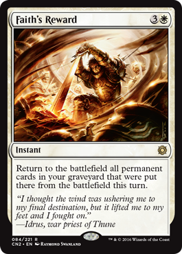 Esto me lo parece a mí, o lo han reeditado en casi todos los Commander, Conspiración y cosas de ésas? De todos modos, cuando hablamos de cartas de tanta calidad como ésta, no podemos poner demasiadas pegas al respecto: un Vindicar instantáneo nunca viene mal, y si bien no siempre molará regalarle un bicho 3/3 al oponente al que le acabas de matar su Walker o su bicho más gordo (normalmente es para eso para lo que se usa esta cosa), esto también puede usarse para sacar un bicho 3/3 de una tierra que te sobre - esa versatilidad tambíén es popular. Nunca sobran estos cartones.