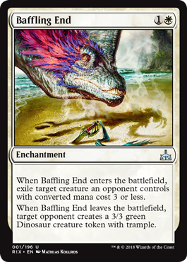 Alguno se acuerda del Atrapar En Seda? Ese matabichos de Dragons of Tarkir, mitad Viaje a la nada y mitad Producir asfixia - parecía muy poca cosa, pero acabó siendo de los favoritos del Standard de entonces, más que nada porque entonces el Caminante Lomohangar estaba hasta en la sopa. En este Standard poco nos vamos a preocupar de cosas como ésa (como mucho, esto se lo puedes tirar a un Rhonas o a un Kefnet, y no es que se jueguen demasiado la verdad). Ahora bien: el detalle de que el bicho se caiga para siempre no debe ser subestimado - claro que regalarle un Dinosaurio 3/3 como se pete el encantamiento igual va a crear dinámicas de juego un poco distintas a con el matabichos original...