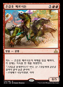 Pedazo de dino-Enrage! Un 2/2 por dos no impone para nada, pero uno que a la que reciba daño (si sobrevive, se entiende) gana contadores +1/+1 de dos en dos puede hincharse como un zepelín! Habrá que ir con cuidado, porque sin otros trucos mediante esto tiene que recibir exactamente un daño para poder ponerse a funcionar - habrá que ver qué tal andamos de enablers viables para Construido. Dónde está el Piromante pródigo cuando hace falta??