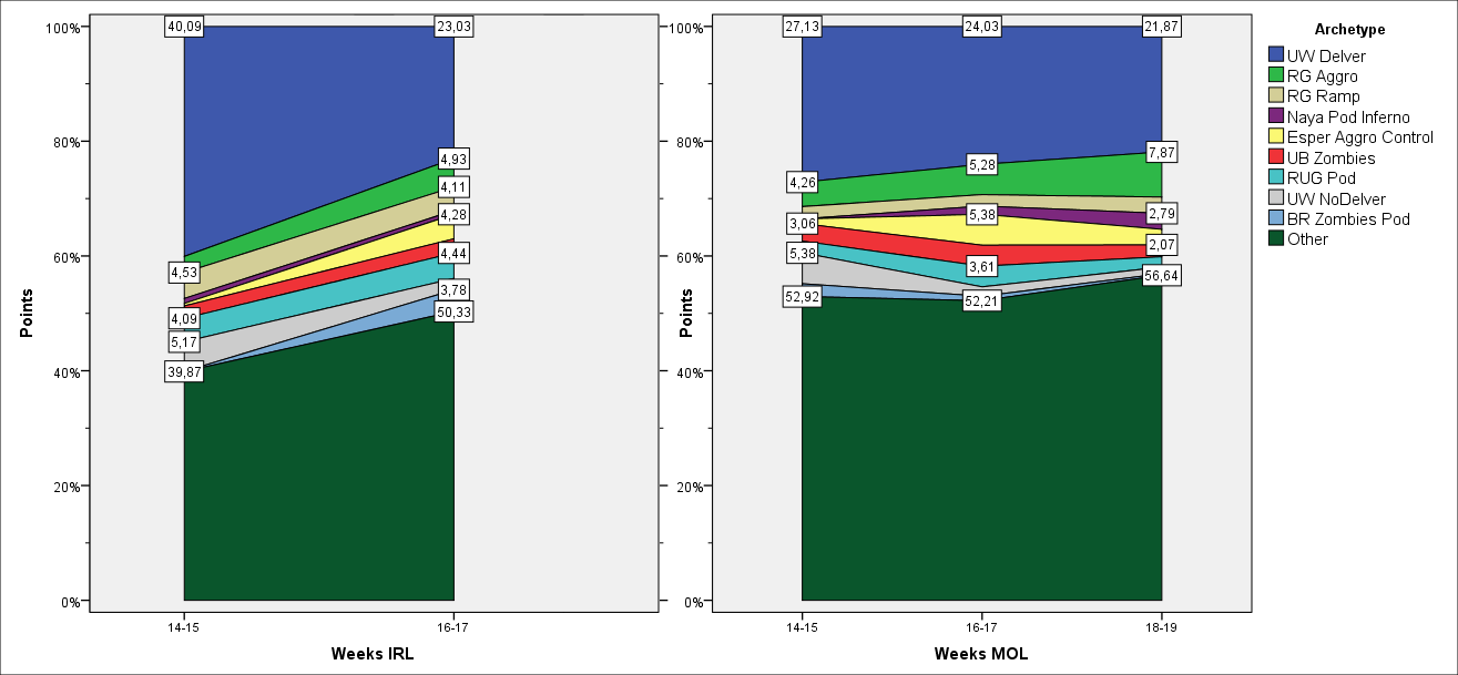 Han pasado más semanas como para intentar ver de nuevo la diferencia entre el metajuego del mundo real y el MOL. Hay consistemente 4 veces más eventos online que offline, así que como mínimo hay que agrupar los resultados de 14 días para poder compararlos.