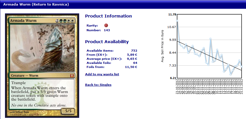 Un ejemplo de lo anterior fue lo que me ocurrió en este preorder de RTR. Me pareció que Armada Wurm podía ser una carta interesante. Conseguí unas cuantas copias a 7,5 €, y esa misma tarde recuerdo que la cosa se fue de madre. Todo el mundo empezó a comprar y llegó a desaparecer de MKM. La gente las repuso rondando los 20€, una barbaridad. Cuando llegó el momento de la verdad y me llegaron las copias ya estaba a 12 €..Dije ¿qué hago? ¿Las intento vender a 18 € esperando que suban porque triunfen en los próximos torneos? O intento deshacerme de ellas a estos precios, total, ya he ganado algo. Eso decidí, y creo que fue acertado, ya que la carta dejó de ver juego tras la primera semana y empezó a perder valor, las últimas copias las solté este fin de semana pasado, en cambio, valorándolas a 10€. Una pequeña victoria, teniendo en cuenta que su valor a día de hoy es todavía inferior.