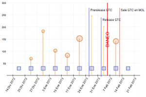 *Gráfico de Línea Temporal (antes Asistencia): El gráfico del número de eventos y la asistencia es eso mismo. En la vertical está la mediana del número de jugadores de los eventos de cada semana, separados en dos puntos de datos: torneos del MOL que no sean PTQs (cuadrados azules) y cualquier otro evento (círculos marrones).