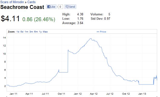 El movimiento de los precios en Magic es algo cíclico en muchas ocasiones. Sobre todo en el mercado de Estándar, donde estos se ven muy influenciados no solo por la cantidad de juego que ven determinadas cartas, sino por el horizonte temporal que les queda de juego, al ser este un formato que rota. Por eso, todos los años a partir de primavera, los precios de las colecciones que van a rotar el siguiente otoño empiezan a caer. Es como el mercado financiero, donde el precio de las acciones recogen y "descuentan" en muchas ocasiones las distintas cuestiones que afectan a cada compañía. Por ejemplo, si se espera un mal resultado en una compañía en concreto, o se oyen fuertes rumores de una posible fusión, el mercado "descuenta" en el precio de la acción de esa compañía toda esa información. En el mercado de Magic se produce algo parecido: una carta puede jugarse muchísimo en Estándar por el mes de julio, pero su precio ya se verá influenciado por si va a rotar dos meses después - creo que el concepto queda claro. Como ejemplo, mirad la evolución del precio de Seachrome coast; por esta época el año pasado marcó su máximo histórico. Luego cayó en picado.