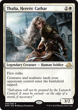 Thalia, Cátara Herética: Thalia vuelve y esta vez con más cuerpo, en este caso un +1/+1 adicional nada desdeñable a costa de aumentar también su coste. La habilidad es totalmente anti-simétrica, al contrario que su predecesora, haciendo que nuestro rival vaya al ralentí, mientras que nosotros podemos atacar tranquilamente mientras sus criaturas están giradas.