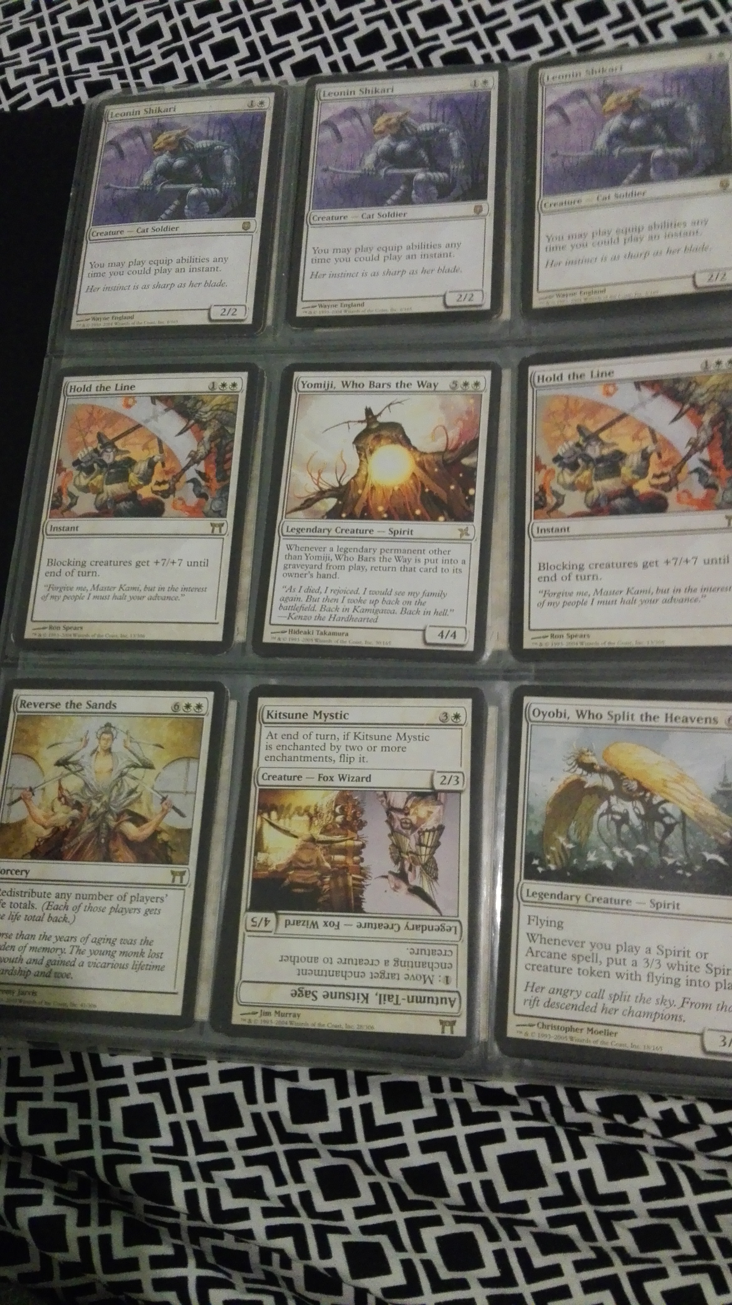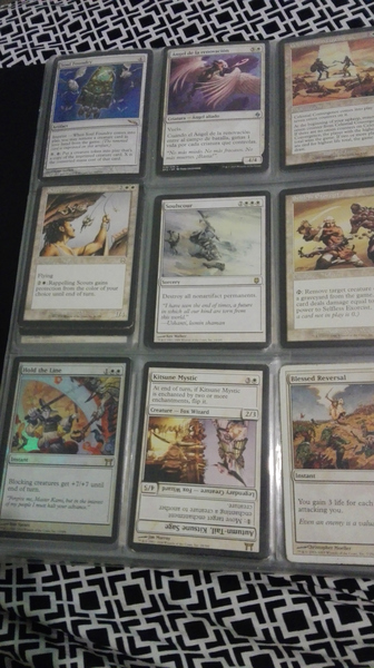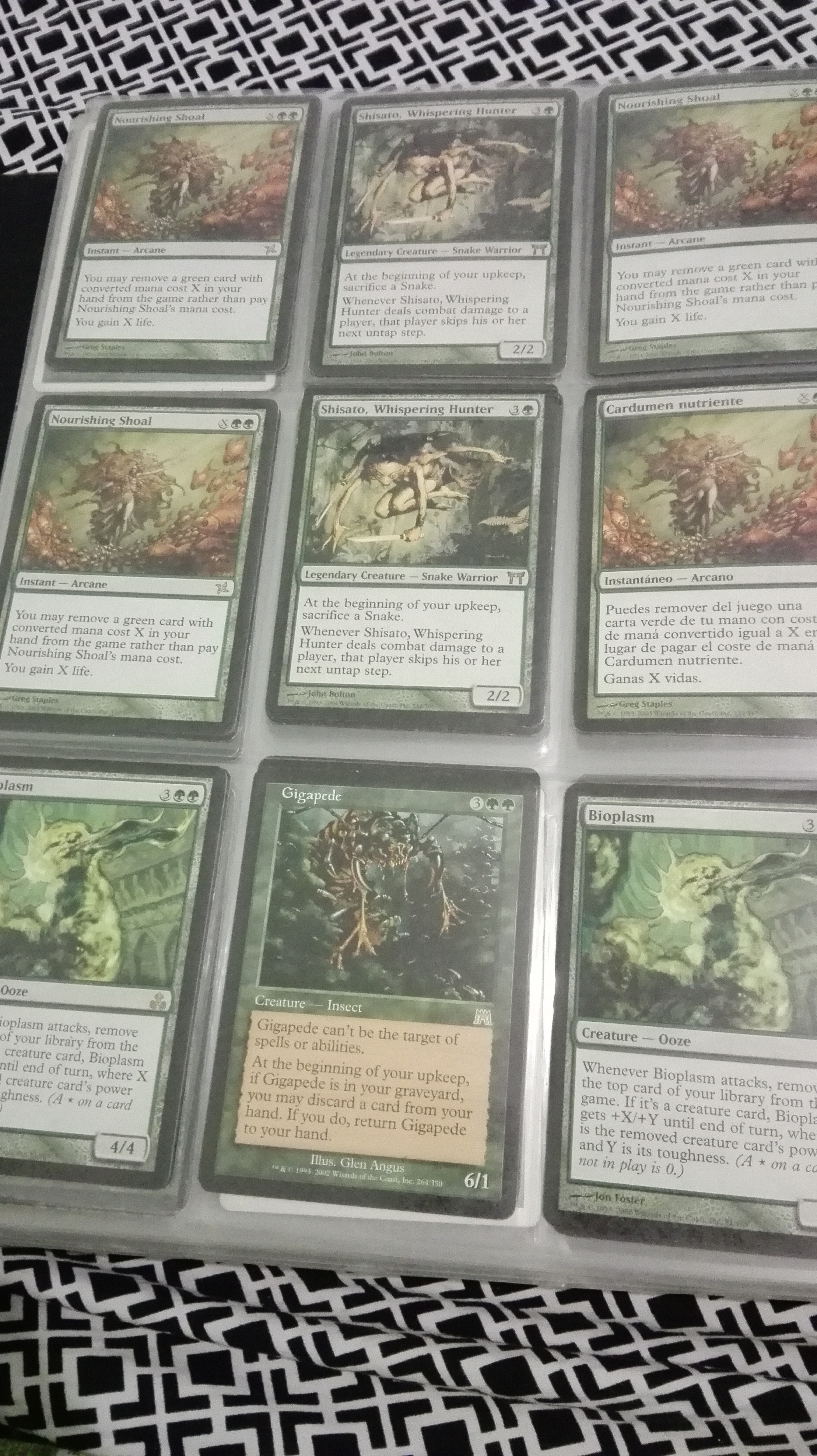 Casi toda la carpeta era basura con contadas excepciones. Al ver 4 copias de Cardumen nutriente, 3 Linterna de la perspicacia, 2 Fist of theSuns, 2 Insurrección, 1 Alarma contra intrusos,5 Seshiro the Annointed y un Campeón de la parroquia imagine mentalmente un precio de $800 pesos mexicanos ($40 usd). Después de eso calcule un aproximado de raras bulk de 400 así que 400 X .10 = $40 usd. Esto me sirvió a redondear y tomando en cuenta que las raras bulk en México se mueven mínimo en $1 peso ($0.05 usd) entonces pude tener en mi mente el número mágico de $1200 pesos ($60 usd).