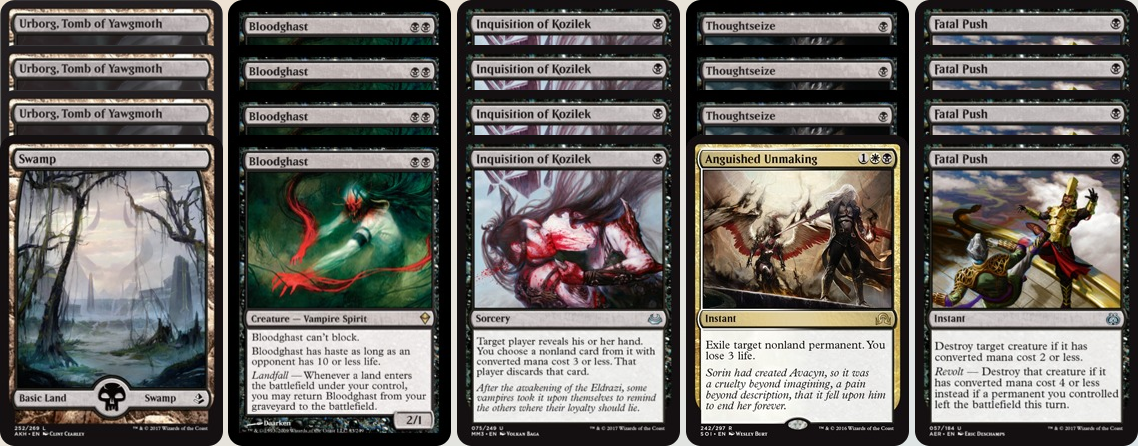 Una vez hayamos minado la mano del oponente, solo restará hacer frente a los pocos permanentes que haya podido dejar en mesa. Para eso tenemos Empujón Fatal, el mejor removal negro impreso hasta la fecha, el cual nos permite no jugar Camino al exilio y así evitar dar ventaja al contrario, ya que las criaturas que no podamos eliminar de esta manera (Tasigur, Pescador del Gurmag, Aniquilador De Realidades) normalmente suelen ser presa de nuestros efectos de sacrificio.