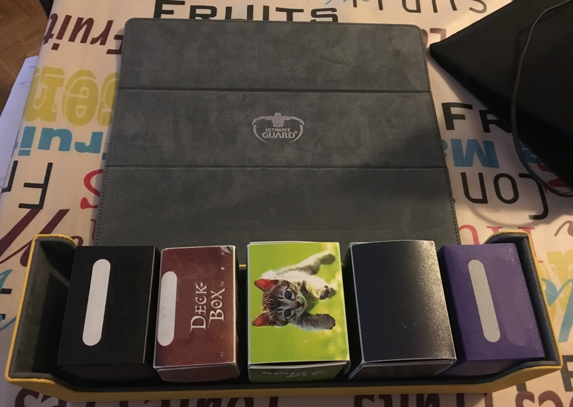 - 3 Cajas de mazo tipo Flip Deck Case (las que son un poquito más grandes). En este caso sobra un poco de espacio, así que podríamos añadir una cuarta caja de las normales.