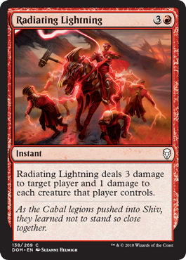 Tres daños a jugador y un daño a toda su mesa, a velocidad de instantáneo; no mal truco para Limitado - especialmente si te toca contra el que se está montando la BG Saprolines. Lo cierto es que esto tiene bastante potencial de ventaja de cartas para ser una chispa común...