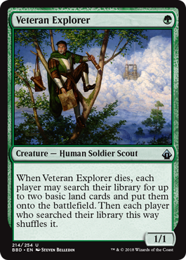 Si os ha gustado el tema de aceleración para todo el mundo, aquí lo tenemos en plan hermandad: todo el mundo (amigos y enemigos) se buscan una tierra básica. No es que sea lo más adecuado darle esas cosas a tus oponentes, pero desde luego es mucho menos peligroso a priori que otros bónuses, como tokens o cartas extra. Y desde luego que un 3/3 por tres manás que busca tierras tanto para tí como para tu equipo no tiene mala pinta en absoluto!