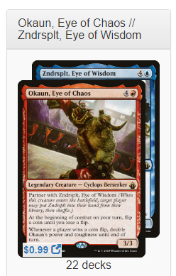 Zndrsplit, Eye of Wisdom por su parte nos hace robar cartas CADA vez que un jugador gana un lanzamiento de moneda (si, si el oponente o nuestro compañero gana el lanzamiento de una moneda nuestra criatura activara sus efectos) mientras que Okaun duplicara su fuerza.
