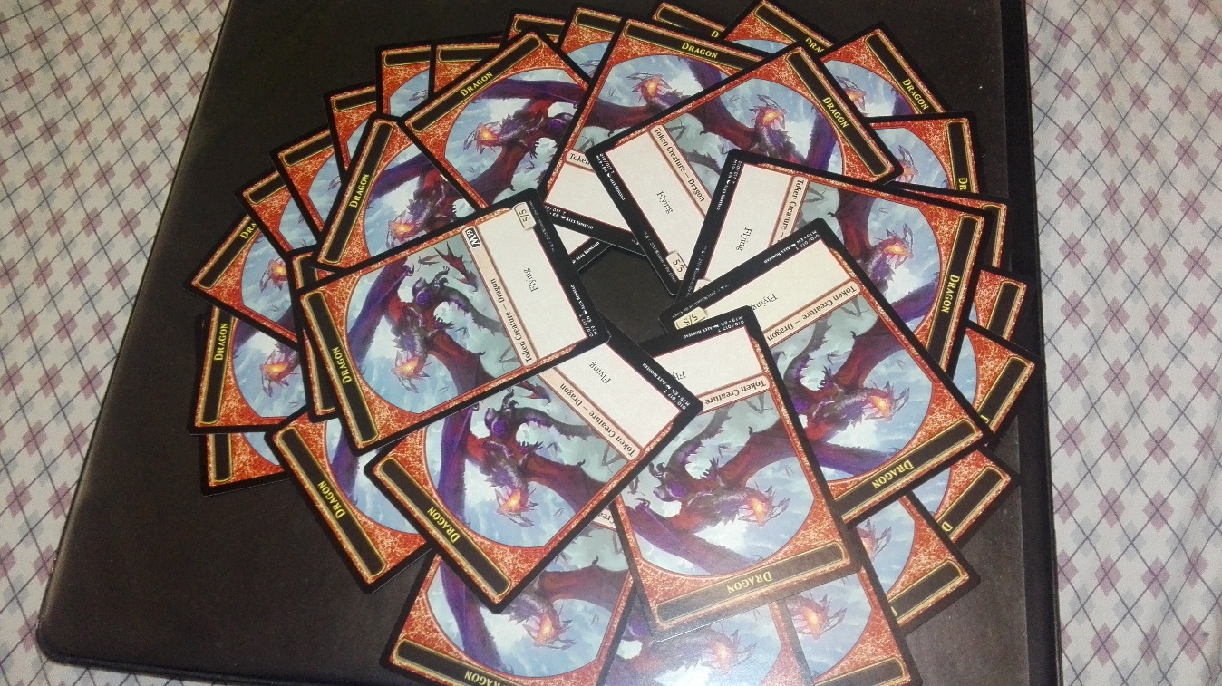 Para los tokens el más escaso fue el avatar del encantamiento de Ajani mientras que el que más salió fue el toptero (piedad, tengo miles de ellos). En total son 48 tokens dragón que un cliente me pidió. Jamás des por sentado que algunas cosas no tengan mercado pues incluso existen coleccionadores de tokens.
