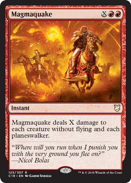 Más material de coste X para la Jund-Landfall - desde luego que le van a sacar brillo a todas esas tierras extra que meten. Los efectos tipo Terremoto han sido bastante populares desde Alpha, pero siempre han tenido el inconveniente de pincharte también tu lado de la mesa - qué tal sería uno que sólo mascara a un jugador? Esto no tiene tanto mordiente en Commander como en formatos de uno contra uno (estar limitado a un único jugador para putear sabe a patatero cuando tienes tres o cuatro oponentes), pero siempre habrá algún jugador díscolo al que no le vendría mal algo de flameo.