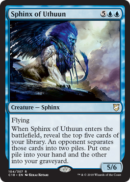 La Cascade Sphinx vuelve a nosotros, y vuelve con esa especie de levante tipo El Dios Escarabajo pero en flojo: cada vez que se te muera, en lugar de eso, se pone la tercera en la parte superior del mazo - como si le hubieran tirado el -3 de Teferi, Héroe De Dominaria; esto no es opcional, ojo, así que no creas que podrás montar excesivos chiringuitos con esto en el cementerio. No recuerdo ni un sólo mazo que jugara esta carta, pero en Commander se me ocurren aún menos razones para no meterla, conque p'adentro si vas a estos colores.