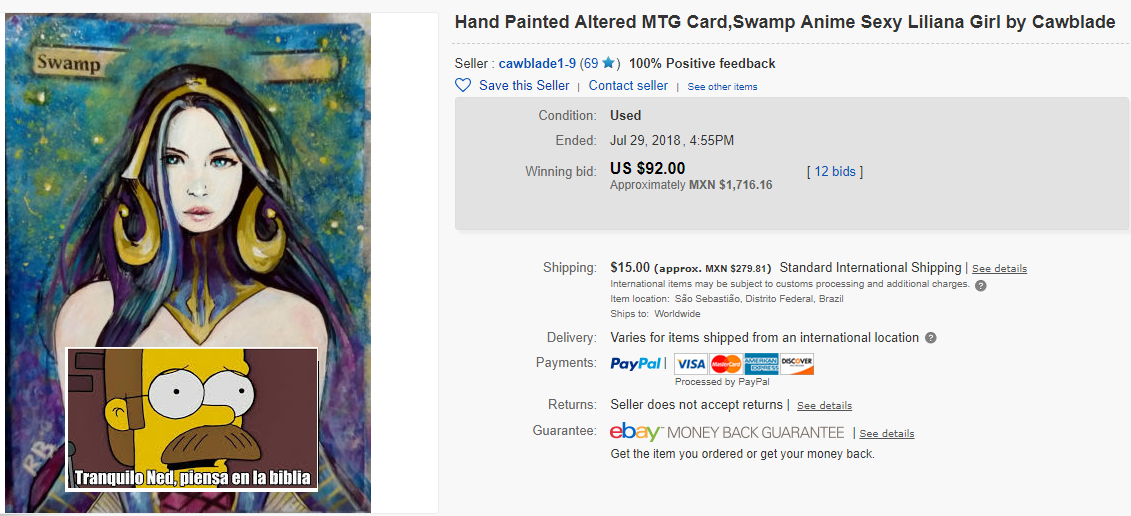 Vi una montaña con una chica en posición provocativa irse en $2 usd y del mismo modo vi una isla similar irse en $20. ¡Este es un maldito pantano básico con una Liliana (mostrando ya te imaginaras que y por eso lo estoy tapando) que se vendió en $90 usd! ¡Eso vale más de 7 Liliana Vess juntas! ¡Que rayos sucede con la gente!