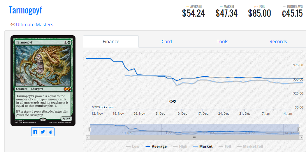 En cuanto a Tarmogoyf este prácticamente ha sido olvidado de Modern dado al gran océano de barajas dentro del formato. Vamos, ni Assasin's Trophy le ha ayudado a sobresalir. Y con eso de que Legacy cada día tiene menos difusión pues ahí podemos entender su bajón de precio gradual.