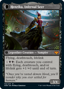 Vampiro legendario con cierto toque a Pacto Demoníaco: cada combate eliges entre tres opciones, no pudiendo repetir ninguna: un Sangre inocente, robar carta y picarte vida, o pasar esto a la cara B: un Halcón nocturno vampiro crecidito con habilidad de mechero universal para cualquiera que tenga Volar, Deathtouch o Lifelink. La tentación de pasarlo a modo Berserk tempranito es grande – por la cara A es un triste 1/3 volador por cuatro manás – pero si te las arreglas para que no te lo maten al turno siguiente puedes sacar bastante value de este bicho. No es Rankle, Maestro De Las Bromas, pero se puede jugar en Estándar al menos.