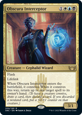 Otro Conniveador ETB - esta vez uno que hace Reenviar y Connive (y de nuevo, si te las arreglas para hacer Connive dos veces con su trigger - fijo que acaban sacado algo para duplicar los triggers de Connive - dos serán los Reenviar que hagas). Puede parecer flojo comparado con otros bicho-counters que han sacado en otras colecciones (por ejemplo el Cazahechizos o el Mística Crestada), pero entre que esto puede pegar de cuatro, que filtra la mano y que va a fastidiar cosa mala a los amantes del Casualty (adiós fotocopia) algún uso puede tener, aunque sea en Estándar.